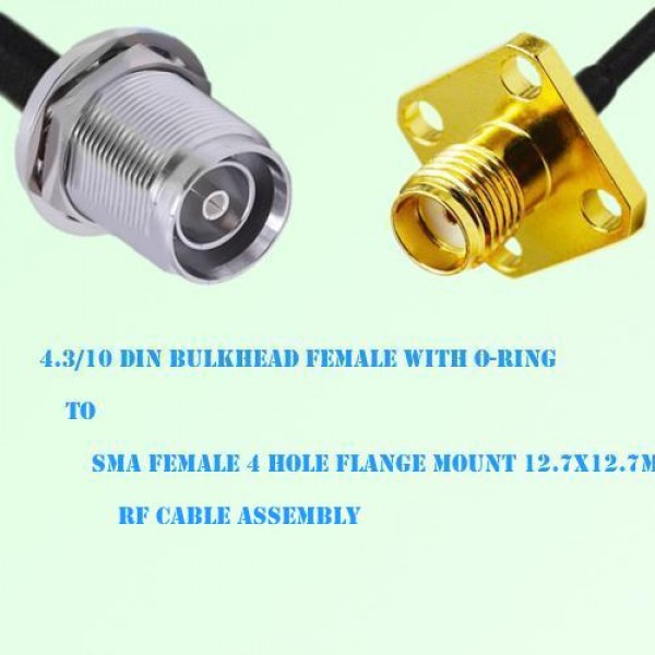 Low Loss Cable Assembly, One Side 4.3 / 10 DIN Bulkhead Female with O-Ring, The Other Side SMA Female 4 Hole Flange Mount 12.7x12.7mm, 50Ω, RG58, RG142, RG223, RG400, LMR195, RG303 Optional.