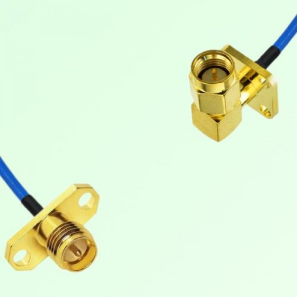 Low Loss 50Ω Semi-Flexible Cable Assembly, One Side SMA Male Right Angle 4 Hole Flange Mount 12.7x12.7mm, The Other Side RP SMA Female 2 Hole Flange Mount, RG405 / .086 Optional.