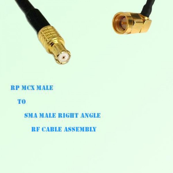 Low loss cable assembly, one side RP MCX Male Straight connector, the other side SMA Male Right Angle connector, 50 Ohm, RG174 / RG316 / RG316D / LMR100 optional.