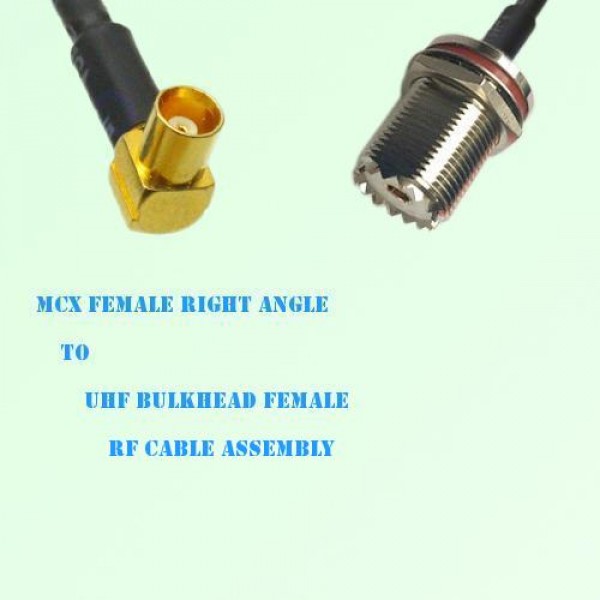 Low loss cable assembly, one side MCX Female Right Angle connector, the other side UHF Bulkhead Female Straight connector, 50 Ohm, RG316 / RG316D / RG174 / LMR100 optional.