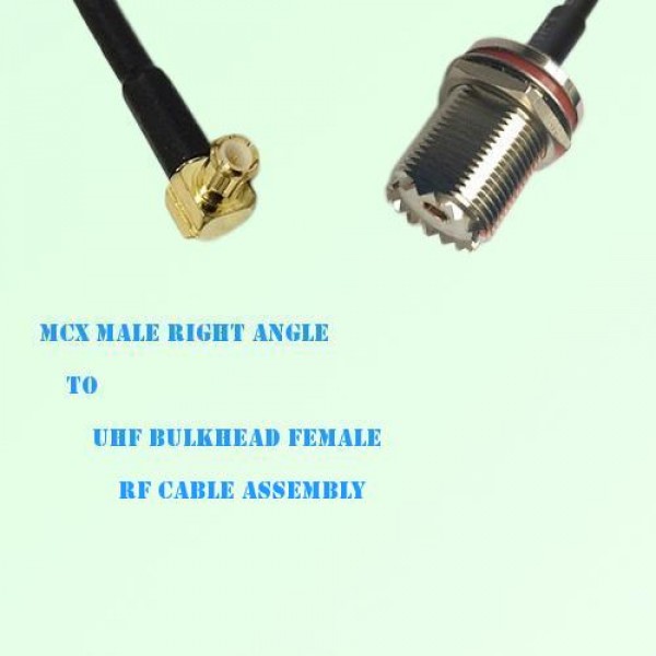 Low loss cable assembly, one side MCX Male Right Angle connector, the other side UHF Bulkhead Female Straight connector, 50 Ohm, RG316 / RG316D / RG174 / LMR100 optional.