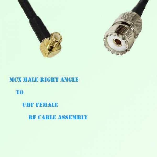Low loss cable assembly, one side MCX Male Right Angle connector, the other side UHF Standard Female Straight connector, 50 Ohm, RG316 / RG316D / RG174 optional.